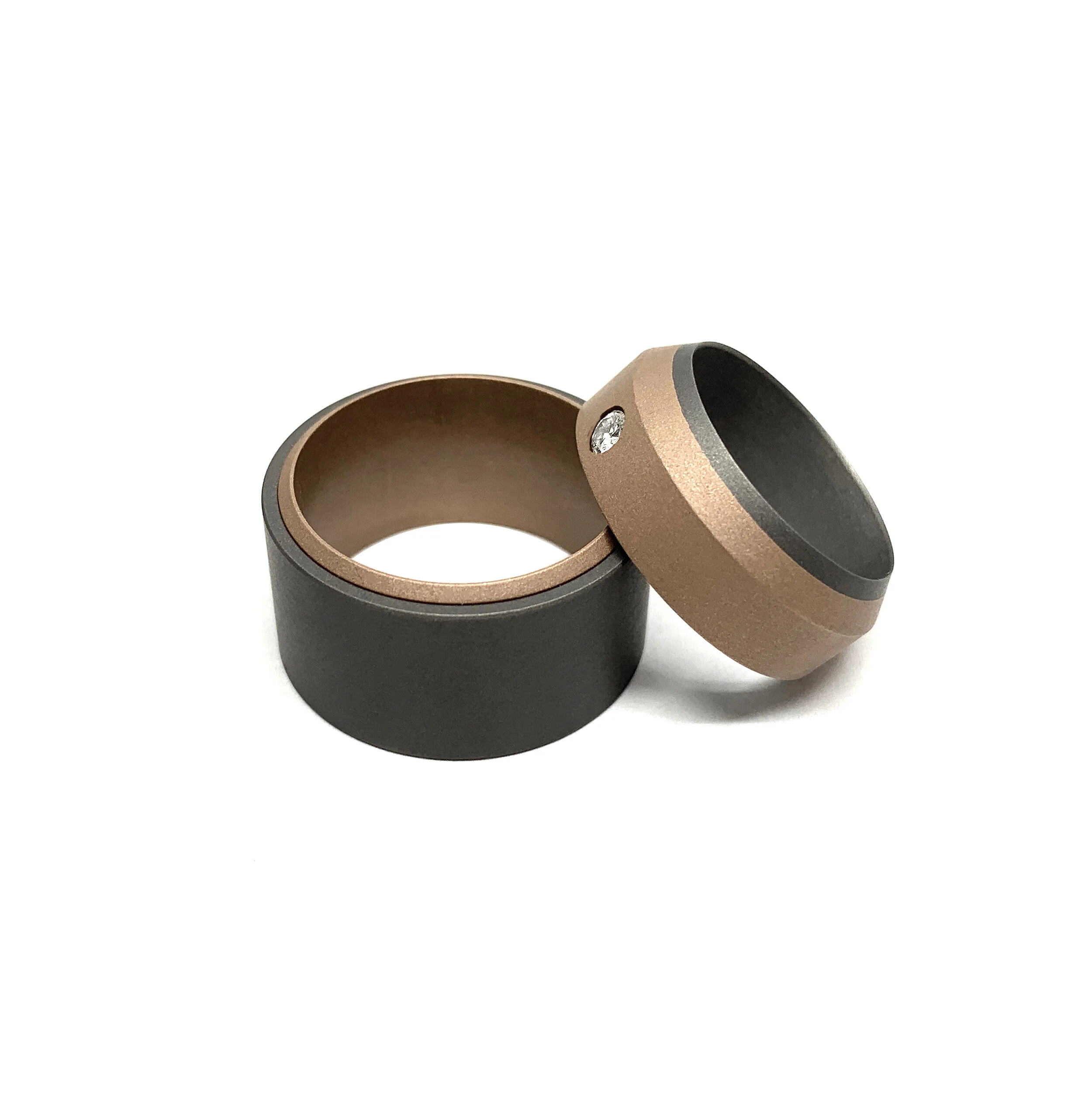 Sandblasted 14k rose gold and titanium band with a .10ct diamond.